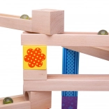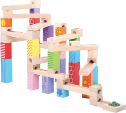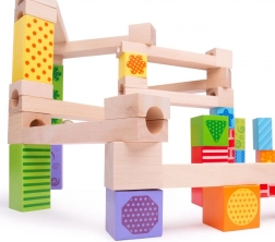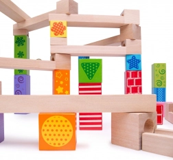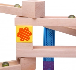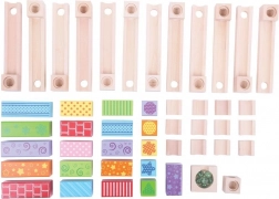 Deze houten knikkerbaan is ideaal voor creatieve kinderen die graag hun eigen banen bouwen. De set bevat 53 stukken die vele variaties en ontwerpen mogelijk maken, afgeleid van de verbeeldingskracht van het kind.