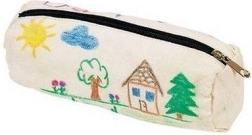 Etui met kindertekeningen van zon, wolkjes, bomen en huizen. Biedt ruimte voor creativiteit en stimuleert de artistieke expressie van je kind.