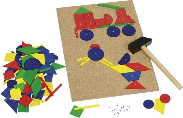 Ontdek leuk en leerzaam speelgoed dat fantasie en geduld stimuleert. Kinderen leggen kleurrijke geometrische vormen op een stevig kurken bord en bevestigen ze met een klein houten hamertje en spijkertjes. De set is perfect voor de eerste constructieprojecten en creatieve spelletjes.
