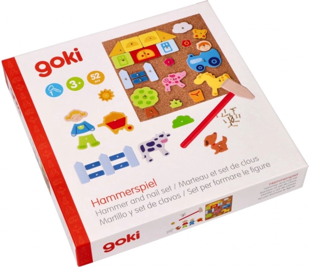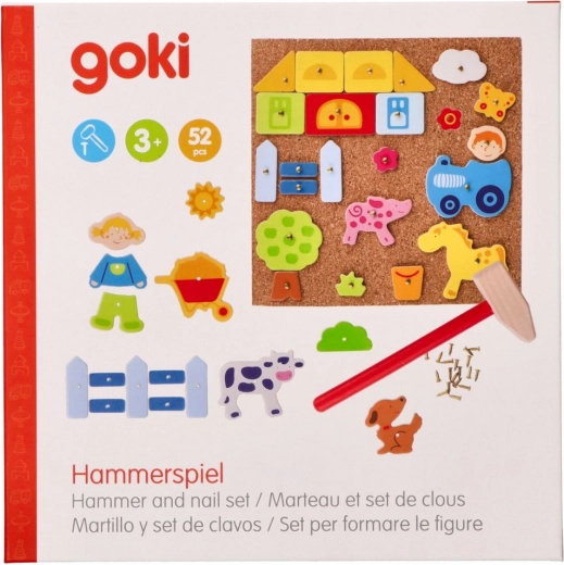 Dit originele Goki Hamer Spel biedt uren speelplezier en creativiteit voor kinderen. De set bevat in totaal 52 stukken - houten vormen, spijkers, kurken ondergrond en hamer, waarmee allerlei afbeeldingen met dieren, boerderijen en andere thema's kunnen worden gemaakt.