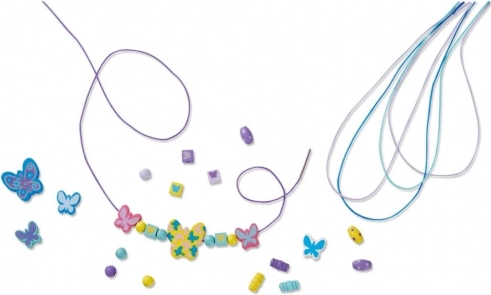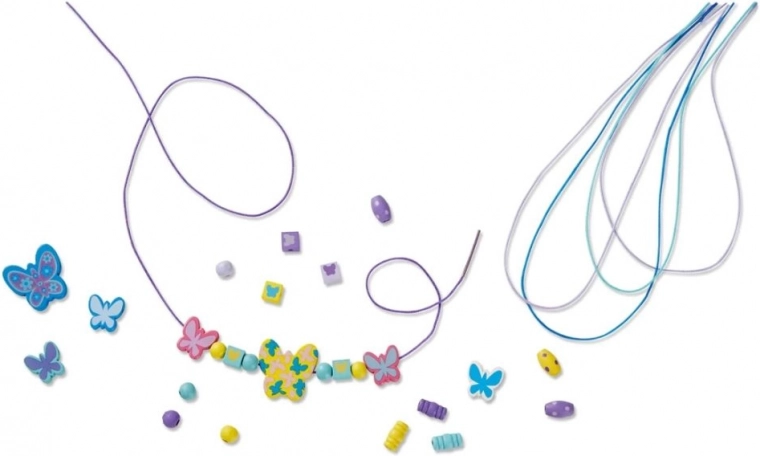 De set bevat houten kralen in verschillende vormen (vlinders, bloemen, bolletjes) en textiele koordjes – ideaal voor het maken van kettingen en armbanden. Stimuleert fijne motoriek en creativiteit, aanbevolen vanaf 4 jaar.