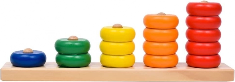 Dit hoogwaardige houten sorteerspel is ideaal voor de eerste stapjes in de wereld van cijfers en kleuren. Kinderen plaatsen effen gekleurde ringen op afzonderlijke pinnen volgens de cijfers op de basis, waardoor ze spelenderwijs leren tellen, sorteren en hand-oogcoördinatie oefenen.