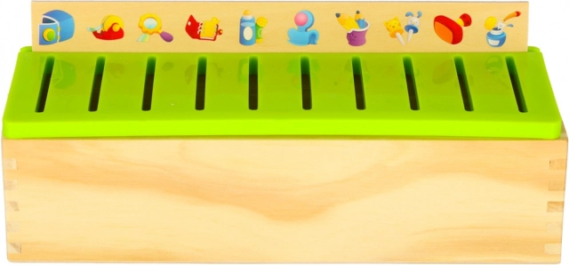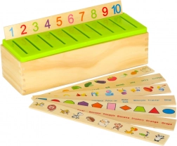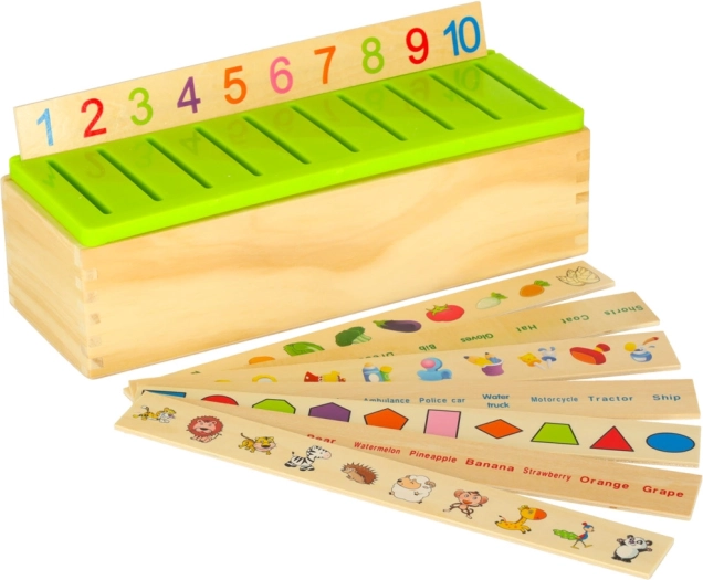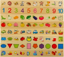 Dit slimme houten spel ontwikkelt het visuele waarnemen, de concentratie en de oog-handcoördinatie. De taak is om het juiste kleine kaartje met afbeelding te kiezen en in de sleuf onder het overeenkomende motief op de grote strook te schuiven. Dankzij de duidelijke illustraties (cijfers, vormen, dieren, fruit, voorwerpen) oefenen kinderen benoemen en sorteren.