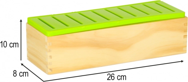 Stevige doos van glad hout en een groen deksel met sleuven voor eenvoudig invoeren. Veilige, zorgvuldig geschuurde randen.
