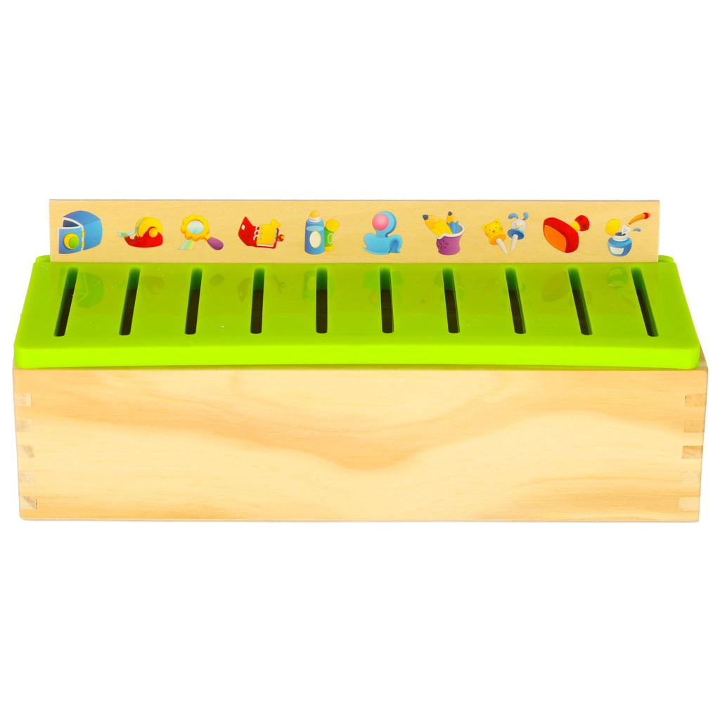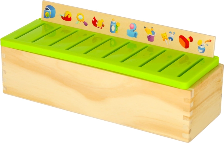 De educatieve sorter is een doordachte houten kist met geventileerde groene deksel en een set grote themaborden (getallen, vormen, dieren, fruit en groenten, vervoersmiddelen enz.). Kinderen koppelen kleine houten kaartjes met kleurrijke illustraties en Engelse termen aan de overeenkomstige afbeeldingen op het bord en schuiven ze in de juiste gleuf. Zo trainen ze observatie, geheugen, concentratie en bouwen ze woordenschat op.