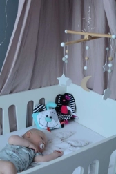 Gemaakt van hoogwaardige en aangenaam aanvoelende materialen (katoen, badstof, minky) die veilig zijn voor pasgeborenen. Voldoet aan de Europese norm EN-71 en draagt de CE-markering. Dankzij de compacte afmetingen is het perfect voor in de kinderwagen, het ledikant en op reis.