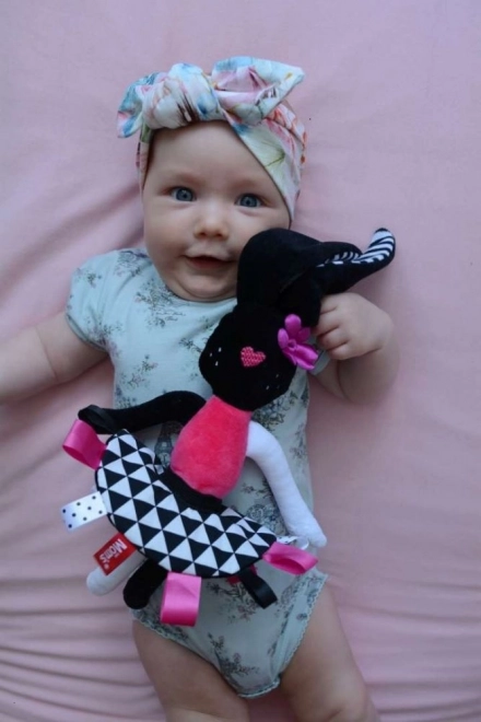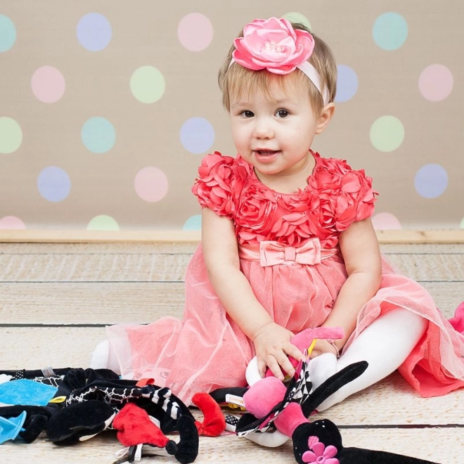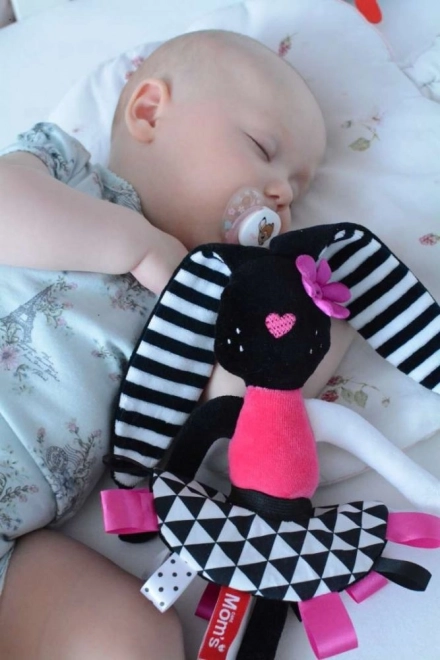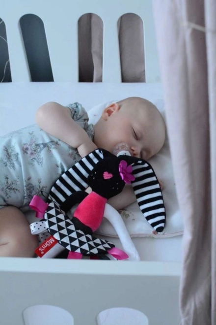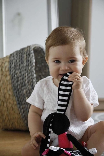 Dit schattige sensorische pluchen konijntje is het ideale eerste vriendje voor pasgeborenen. Het combineert contrasterende zwart-witte patronen, verschillende texturen en knisperende elementen voor veelzijdige stimulatie van zicht, gehoor en tast. Het is zacht, veilig vanaf 0+ en gemaakt van gecertificeerde materialen die zacht zijn voor de babyhuid.