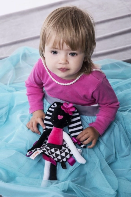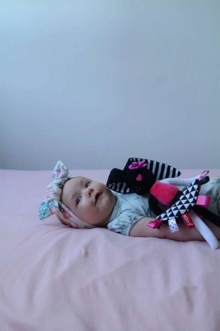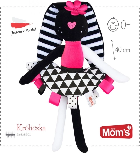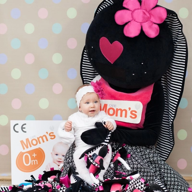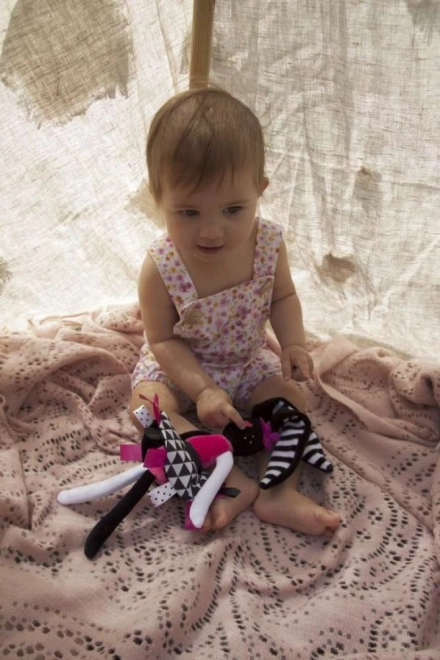 Dit zachte konijntje is ontworpen om de zintuiglijke ontwikkeling van de baby vanaf de eerste dagen te ondersteunen. Sterke contrasten, het zachte geknisper in de oortjes en het rokje en de kleurrijke labeltjes trekken op natuurlijke wijze de aandacht, kalmeren en helpen de oog-handcoördinatie te ontwikkelen. Lange oren en ledematen zijn gemakkelijk vast te pakken, zodat het kind de grijpreflex en fijne motoriek traint.
