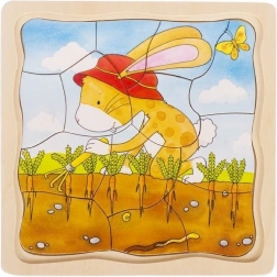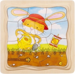 Deze meerlaagse houten puzzel toont vier fasen in de ontwikkeling van de wortel – van zaad tot en met de oogst. Elke laag heeft een andere afbeelding en een verschillend aantal stukjes, waardoor de moeilijkheid op natuurlijke wijze toeneemt en de aandacht van kinderen behouden blijft. De stevige houten plaat met frame zorgt voor comfortabel en stabiel puzzelen.