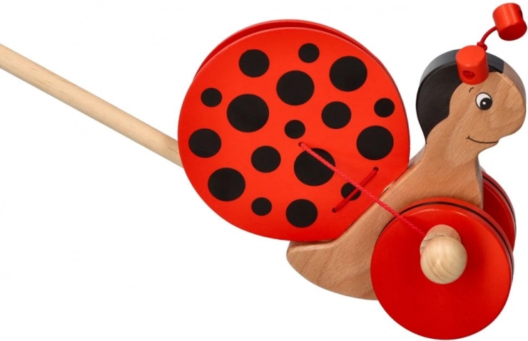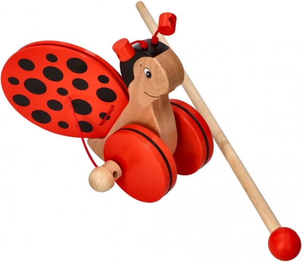 Houten duwlieveheersbeestje op stok voor kinderen vanaf 1 jaar. Stimuleert motoriek en evenwicht, veilige afwerking, CE-gecertificeerd, licht en duurzaam speelgoed.
