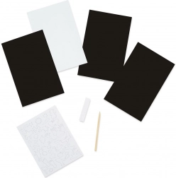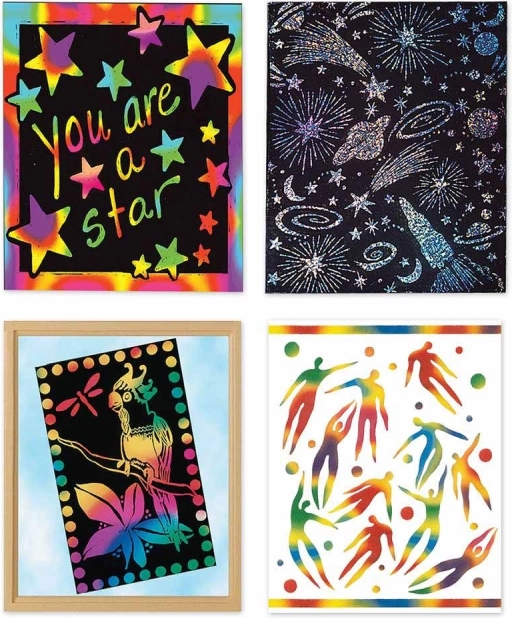 Met deze set maken kinderen en volwassenen originele kunstwerken. Kras zachtjes met het meegeleverde houtstokje over het zwarte oppervlak en daaronder verschijnen regenboog- of holografische kleuren. De afgewerkte afbeeldingen kun je eenvoudig inlijsten en tentoonstellen.