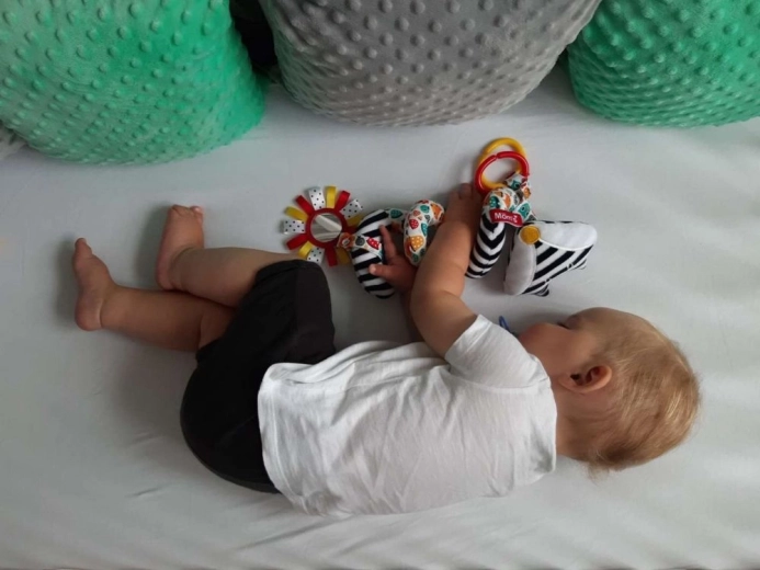 De spiraal wikkel je eenvoudig en veilig om de beugel van de kinderwagen, het autostoeltje of het ledikant, zodat hij altijd binnen handbereik is – thuis en onderweg. Gemaakt van veilige materialen, voldoet aan de norm EN-71 en geproduceerd in Polen, wat de kwaliteit en zorgvuldige afwerking bevestigt.