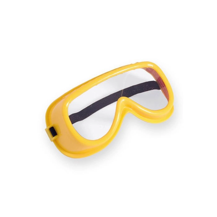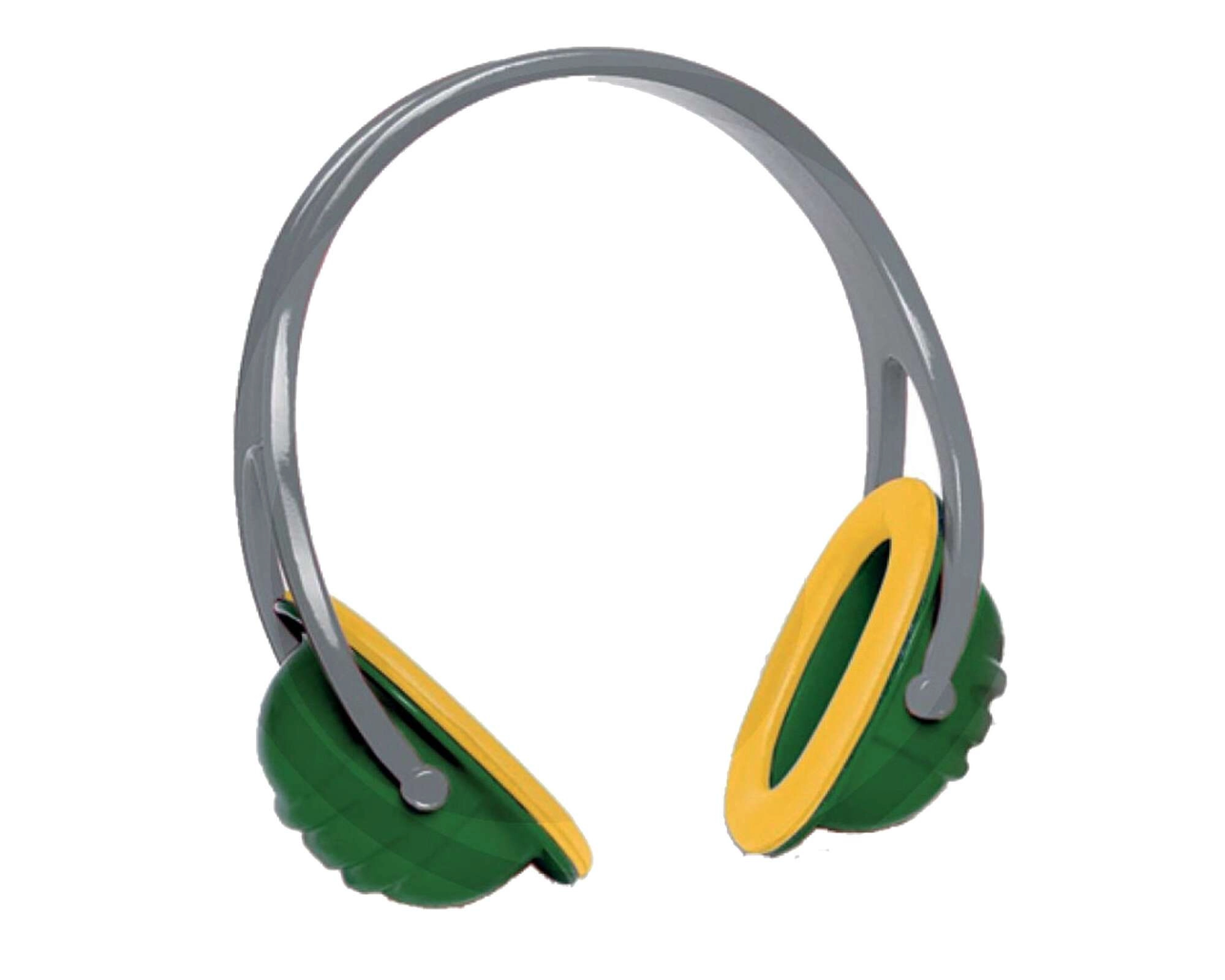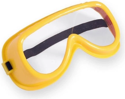 Gele bril met transparante kunststof glazen en elastische band, aangevuld met lichte gehoorbeschermers in groen-gele uitvoering voor een nog realistischer speelervaring.