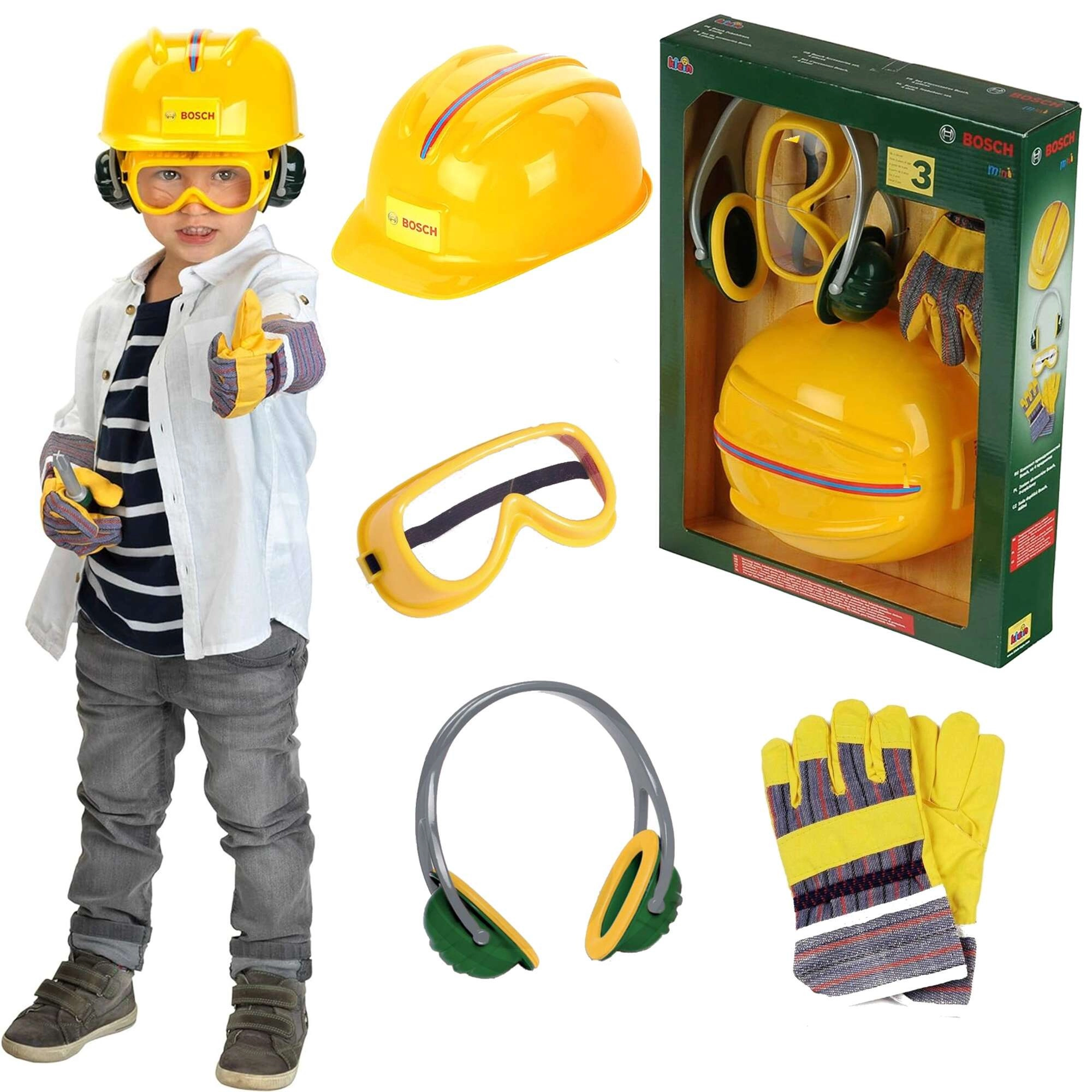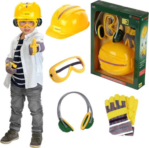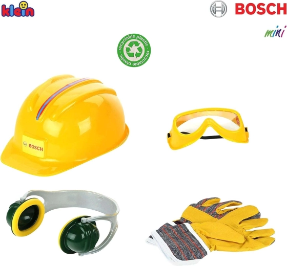 Een leuke en veilige set voor kleine bouwers van het merk Klein met BOSCH mini-licentie. Bevat een kinder helm, bril, gehoorbeschermers en handschoenen. Perfect voor doen-alsof-monteur, het stimuleren van de verbeelding en rollenspel met de nadruk op “veilig werken” op kinderniveau.
