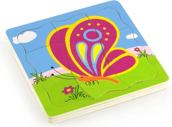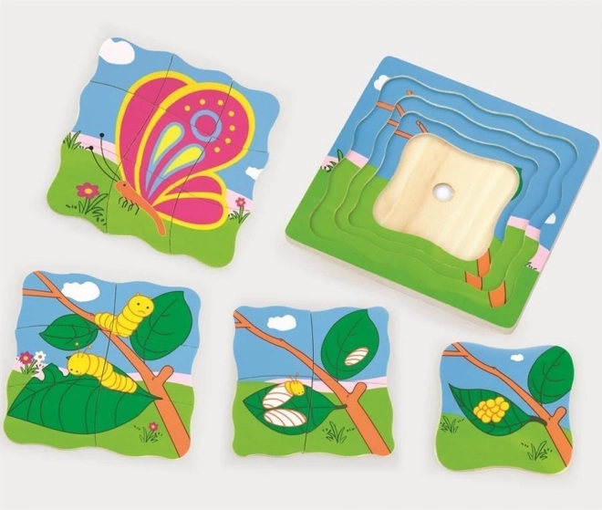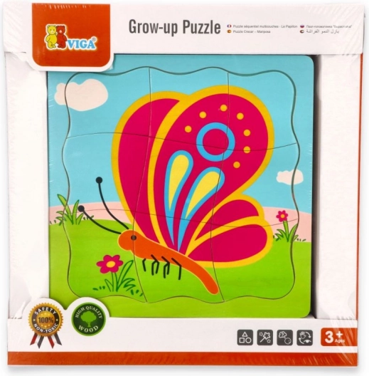 Ontdek de magie van gelaagde puzzels met een vlindermotief. De houten puzzel bevat 11 stukjes verdeeld over 4 lagen, waardoor fijne motoriek, logisch denken en ruimtelijk inzicht worden gestimuleerd. Dankzij het compacte ontwerp neemt het voltooide speelgoed weinig ruimte in.