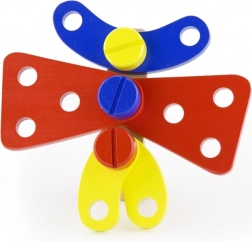 Een gevarieerde selectie schroeven, moeren, plaatjes en wieltjes maakt het mogelijk tientallen modellen te bouwen – van dieren tot voertuigen en helikopters. Ideaal voor de ontwikkeling van fantasie en geduld.