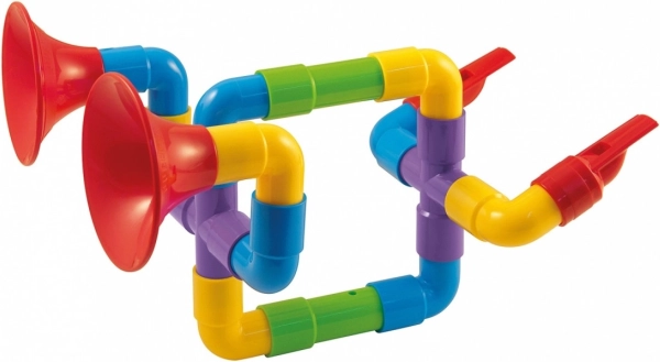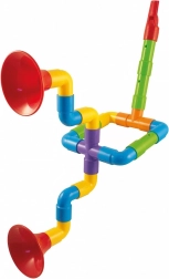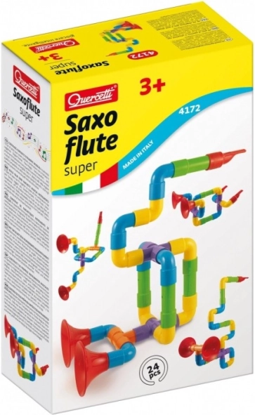 Met de bouwset Quercetti Saxoflute Super kunnen kinderen hun eigen muziekinstrumenten maken, zoals saxofoons, fluiten en trompetten van gekleurde plastic buizen en connectors. De set bevat 24 onderdelen die verschillende combinaties en vormen mogelijk maken. Hierdoor ontwikkelt het speelgoed niet alleen creatief denken, maar ook fijne motoriek en verbeeldingskracht.