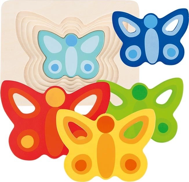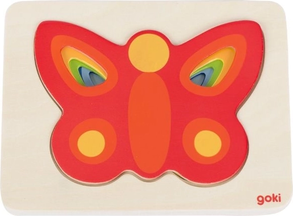 Ontdek de speelse meerlaagse inlegpuzzel met kleurrijke vlinders van het merk GOKI. Kinderen beleven veel plezier tijdens het leggen en ontwikkelen tegelijk fijne motoriek, kleurherkenning en logisch denken. Er zijn vijf stukjes en in elke laag past slechts één vlinder, wat geduld en doorlopend leren stimuleert.