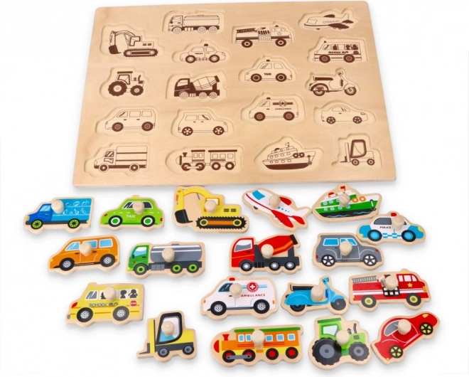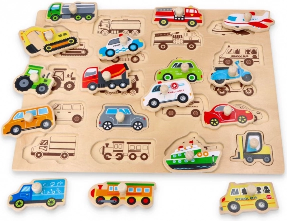 Deze hoogwaardige inlegpuzzel van natuurlijk hout biedt kinderen veilig en boeiend spel. Elk puzzelstuk stelt een ander voertuig voor en heeft praktische houten knopjes voor gemakkelijk vastpakken met kleine handjes. Op de onderplaat staan opgedrukte contouren die kinderen helpen de stukjes correct te plaatsen en hen vormen en kleuren leren herkennen.