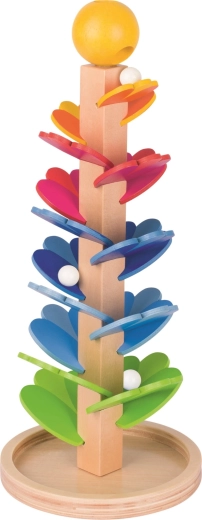 Deze hoogwaardige houten spiraal van het merk GOKI heeft de vorm van een toren met trapsgewijs geplaatste, uitgesneden blaadjes in verschillende kleuren. Kinderen leggen een knikker in de opening bovenaan en kijken hoe hij geleidelijk naar beneden rolt, waarbij zachte, melodische klanken ontstaan. Het speelgoed is ontworpen om fijne motoriek, logisch denken en geduld te stimuleren.