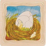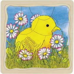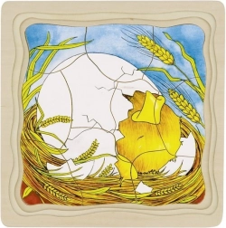 Deze bijzondere houten puzzel is verdeeld in vier lagen afbeeldingen, waarbij elke laag een ontwikkelingsstadium van de kip voorstelt. Elke laag heeft een ander ontwerp en een verschillend aantal stukjes, wat voor afwisseling zorgt en de fantasie van kinderen prikkelt. De puzzel is geplaatst op een stevige basisplaat met gefreesde randen die dient als stabiele ondergrond om te leggen.