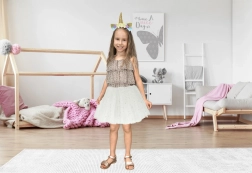 De elastische taille van het rokje past zich gemakkelijk aan het lichaam van het kind aan; het materiaal is licht en geschikt voor langdurig dragen.