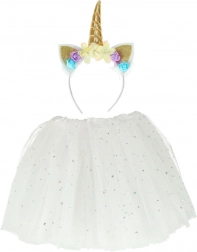Het betoverende eenhoornkostuum brengt kinderen veel plezier en ruimte voor fantasie. Het lichte tuturokje met sterretjes zwiert mooi mee bij beweging, terwijl de haarband met gouden hoorn en bloemen de hele styling een magische touch geeft.