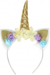 Comfortabele haarband met glanzende hoorn, sprankelende oortjes en kleurrijke bloemen die het eenhoornkostuum prachtig completeren.