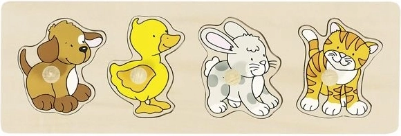 Deze kwalitatieve houten inlegpuzzel met huisdiermotief helpt kinderen vormen en kleuren te herkennen, traint de oog–handcoördinatie en stimuleert logisch denken. Geschikt vanaf 12 maanden, wanneer kinderen de wereld spelenderwijs ontdekken.