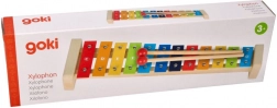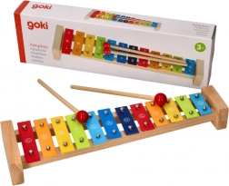 De kleurrijke Goki-xylofoon met zangbundel Regenboog is een geweldige keuze voor een eerste kennismaking met muziek. De robuuste houten constructie in combinatie met metalen toetsen zorgt voor een aangenaam geluid en een lange levensduur. Dankzij de notennamen op de toetsen en de kleurgeleiding in de zangbundel begrijpen kinderen eenvoudig het verband tussen kleuren, tonen en simpele melodieën.