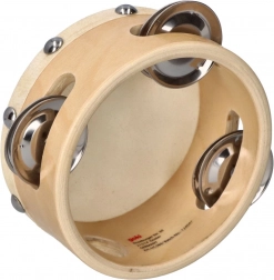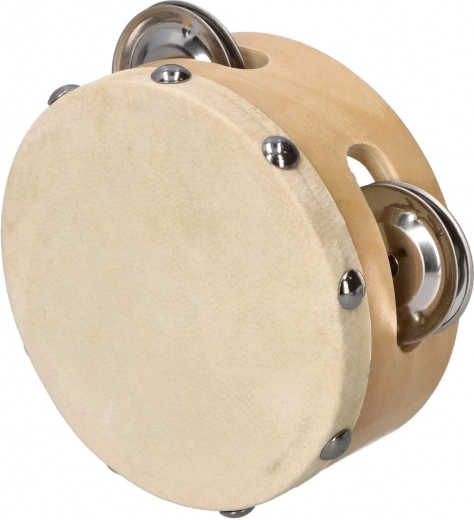 De tamburijn heeft een traditioneel uiterlijk met een natuurlijk houten lichaam en stevig bevestigde metalen bekkens.