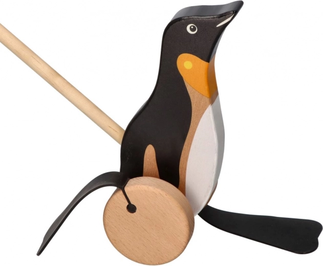 De houten trekdier in de vorm van een pinguïn brengt plezier en ontwikkelt kinderen op speelse wijze.