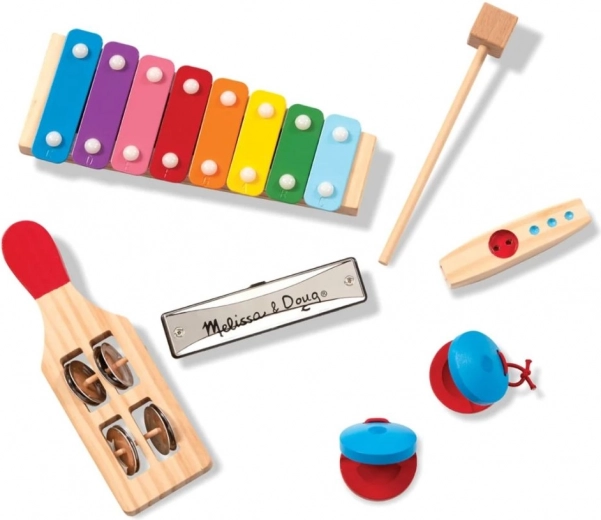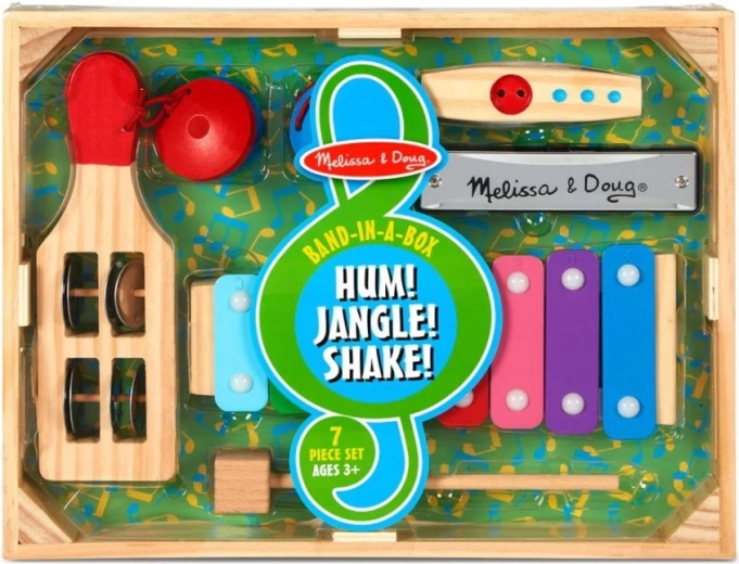 Deze kleurrijke set biedt kinderen hun eerste muzikale ervaringen in een veilige en duurzame uitvoering. Houten en metalen elementen zorgen voor een prettige klank, een goede grip en een lange levensduur. Dankzij de verschillende instrumenten oefenen kleine muzikanten ritme, handcoördinatie en gehoor.