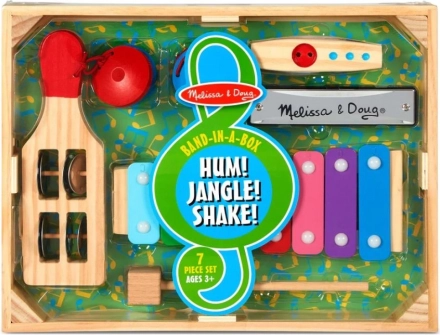 Ontdek het plezier van muziek met de Melissa & Doug muziekinstrumentenset voor kinderen. Bevat een xylofoon met stokje, mondharmonica, castagnetten en een klapper in een stevige houten box. Stimuleert ritme, gehoor en fijne motoriek, geschikt vanaf 3 jaar en voldoet aan CE.