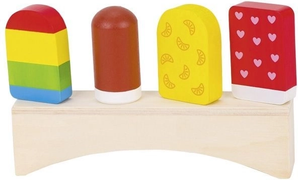 De set bevat 4 verschillende houten ijsjes, elk met een uniek ontwerp, zodat iedereen zijn favoriet kan vinden. Deze speelgoedjes zijn ideaal voor kinderen die graag in de rol van verkoper of klant kruipen. De houten basis biedt een geweldige gelegenheid om de ijsjes tentoon te stellen op een plank of speeltafel.