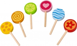 Elke van de zes houten lolly's heeft zijn eigen unieke ontwerp, dat de verbeelding en creativiteit van kinderen inspireert.