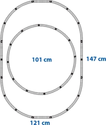 Het railsysteem maakt het mogelijk om twee circuits te creëren: een binnenste van 101 cm en een buitenste van 147 cm.