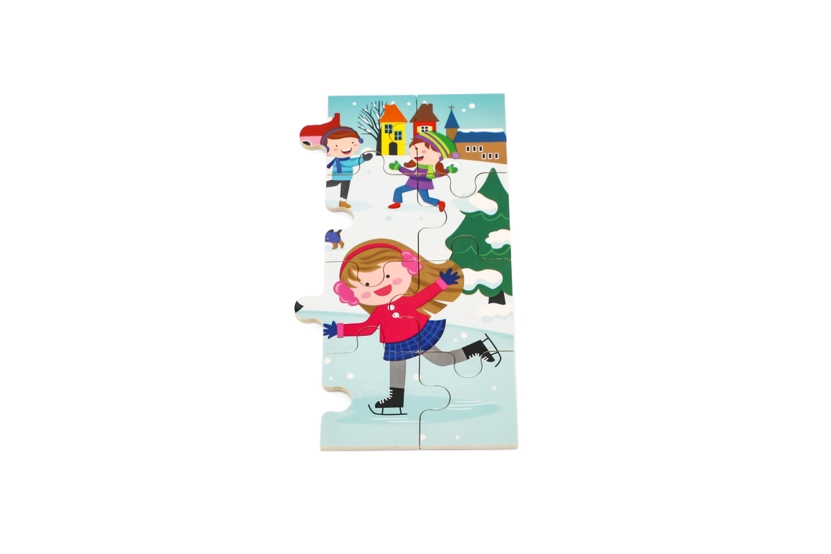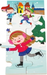 De kleurrijke winterscène met spelende kinderen in de sneeuw motiveert om te puzzelen en stimuleert het waarnemen van kleuren, details en situaties.