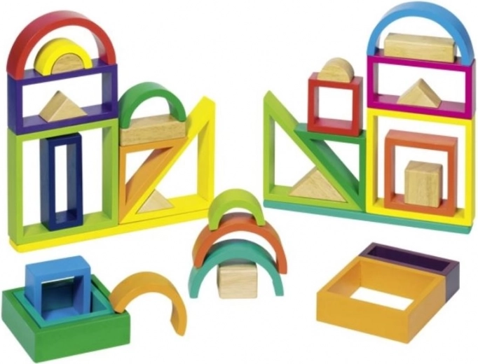 Ontdek een creatieve wereld met de houten Goki Regenboog-bouwset met 38 kleurrijke onderdelen, die kinderen gebruiken om 2D- en 3D-bouwwerken te maken – van torens tot kleine huisjes. Geometrische vormen ontwikkelen de ruimtelijke verbeelding, fijne motoriek en stimuleren de creativiteit. Geschikt voor kinderen vanaf 3 jaar.