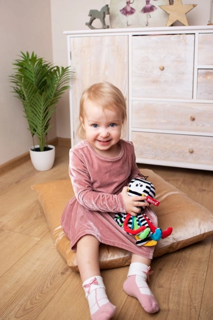 Het eerste zintuiglijke speeltje voor je baby – de zwart‑witte octopus is ontworpen met de behoeften van de allerkleinsten in gedachten. Het hoge contrast van de patronen ondersteunt de ontwikkeling van het zicht in de vroege weken, de zachte tentakels geven een gevoel van geborgenheid en de verschillende oppervlakken nodigen uit om met aanraking te ontdekken. Het zachte belletje voegt een kalmerende auditieve prikkel toe.
