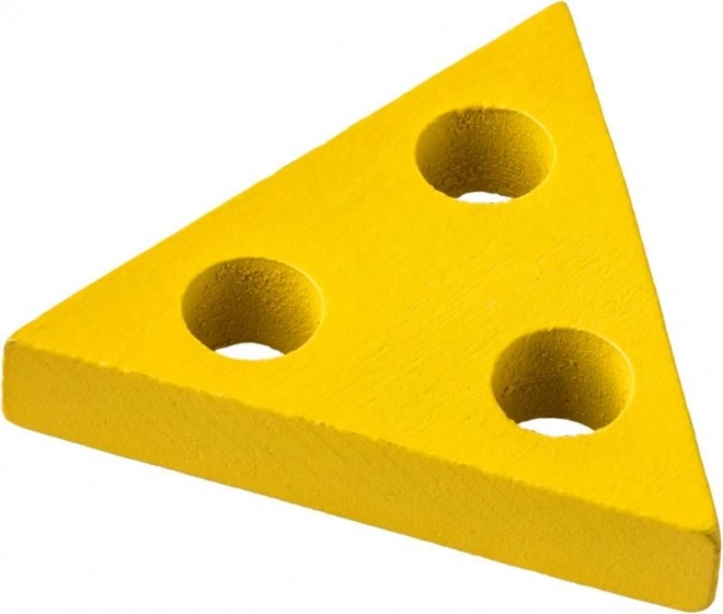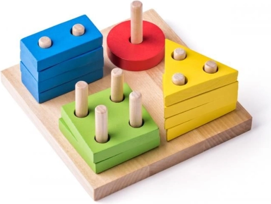 De kleurrijke houten inlegpuzzel stimuleert de fijne motoriek, oog-handcoördinatie en het vermogen om kleuren en vormen te onderscheiden. Op de stevige houten basis zitten pinnetjes waarop kinderen ringen, rechthoeken, driehoeken en vierkanten rijgen, afhankelijk van het aantal gaatjes.