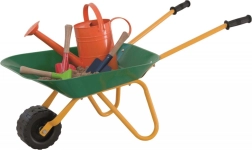 De kruiwagen bevat leuke tuinwerktuigen zoals een gieter en een schep, die het spelen verrijken.