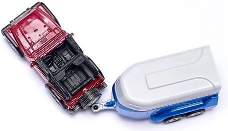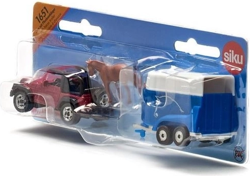 Een Jeep-voertuig met een speciale trailer voor het vervoer van paarden, vervaardigd uit hoogwaardige metalen en kunststof onderdelen.