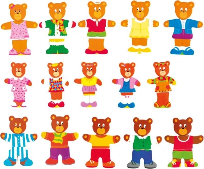 Kleed de beertjes aan naar stemming en gelegenheid en leer tegelijkertijd vormen en kleuren combineren. Kinderen wisselen eenvoudig hoofdjes, lijfjes en beentjes, trainen hun observatievermogen en verzinnen vrolijke verhaaltjes. Het praktische houten doosje houdt alle stukjes bij elkaar en het deksel dient als stabiele onderlegger om op te puzzelen.
