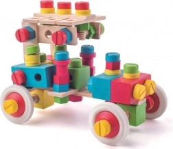 Aangename houten onderdelen in combinatie met kleurrijke kunststof verbindingsstukken ontwikkelen de fijne motoriek, oog-handcoördinatie en stimuleren creatief denken.