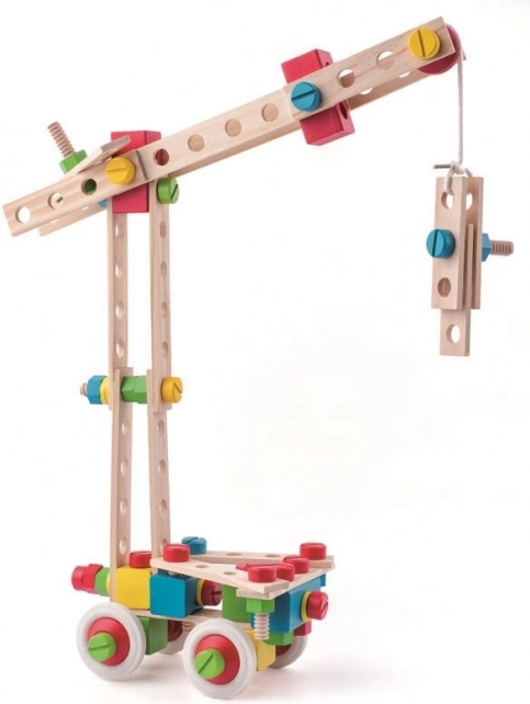 Een rijke set componenten (elementen, verbindingsstukken, schroeven en wielen) geeft kinderen ruimte voor vrij bouwen en het maken van eenvoudige modellen van voertuigen en constructies.