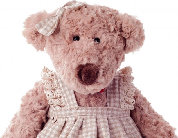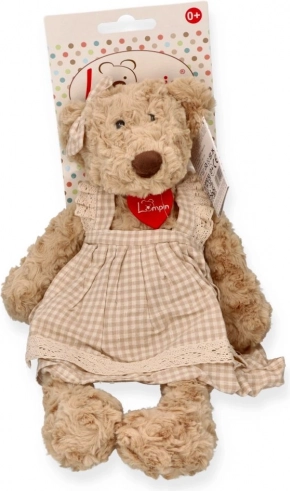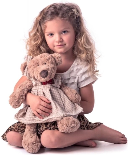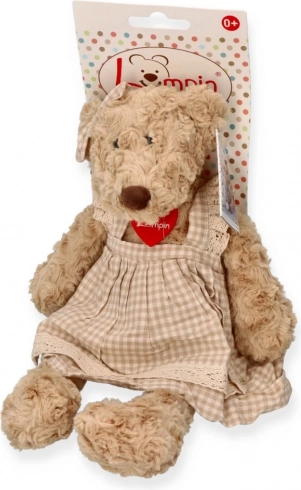 Maak kennis met teddybeer Lumpinka – zacht, knuffelig en klaar om vanaf dag één plezier te brengen. Ze is gekleed in een charmante geruite jurk met kant en een strikje, waardoor ze een stijlvolle metgezel is voor zowel in bed als op het plankje.