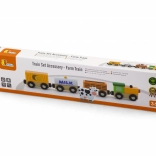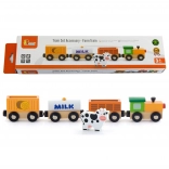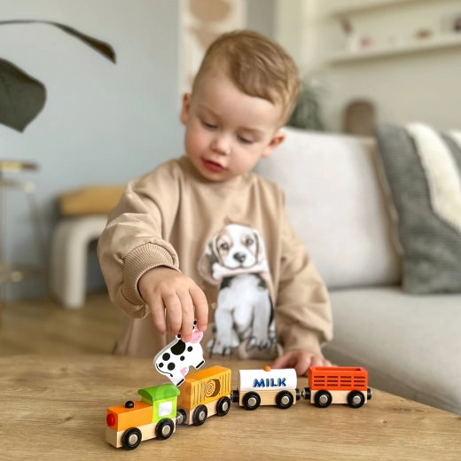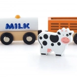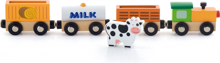 De set bevat een locomotief en drie wagons – een tankwagon gemarkeerd met MILK, een veewagon met een koe en een laadwagon. Gladde randen en een robuuste uitvoering zijn ideaal voor de kinderkamer en voor kleuterscholen.