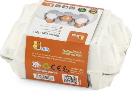 Realistische set houten eieren van VIGA in een kartonnen doosje zorgt voor uren speelplezier in de kinderkeuken. Stimuleert rollenspel, fijne motoriek en creativiteit. Veilige niet-giftige verven en duurzame afwerking voor een lange levensduur. Ideale aanvulling voor zowel kinderwinkel als keuken.
