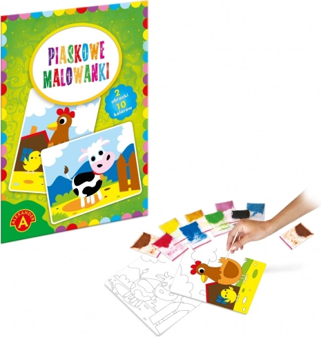 Het creatieve spel met schilderen met zand bestaat uit het stapsgewijs verwijderen van afzonderlijke uitgesneden delen van de afbeelding om het kleverige oppervlak van het gekozen fragment bloot te leggen. Elk blootgelegd fragment wordt bestrooid met zand in de kleur die overeenkomt met het voorbeeld in de handleiding en op de doos.